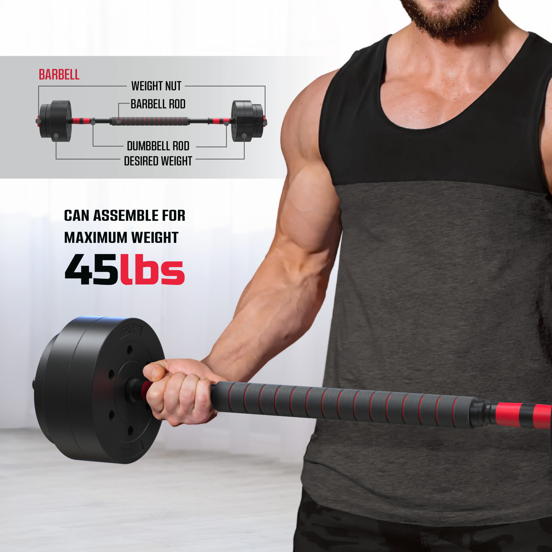 • 5-in-1 multi-use workout set: Functions as adjustable dumbbells, barbell, kettlebell, ab roller, and push-up handles