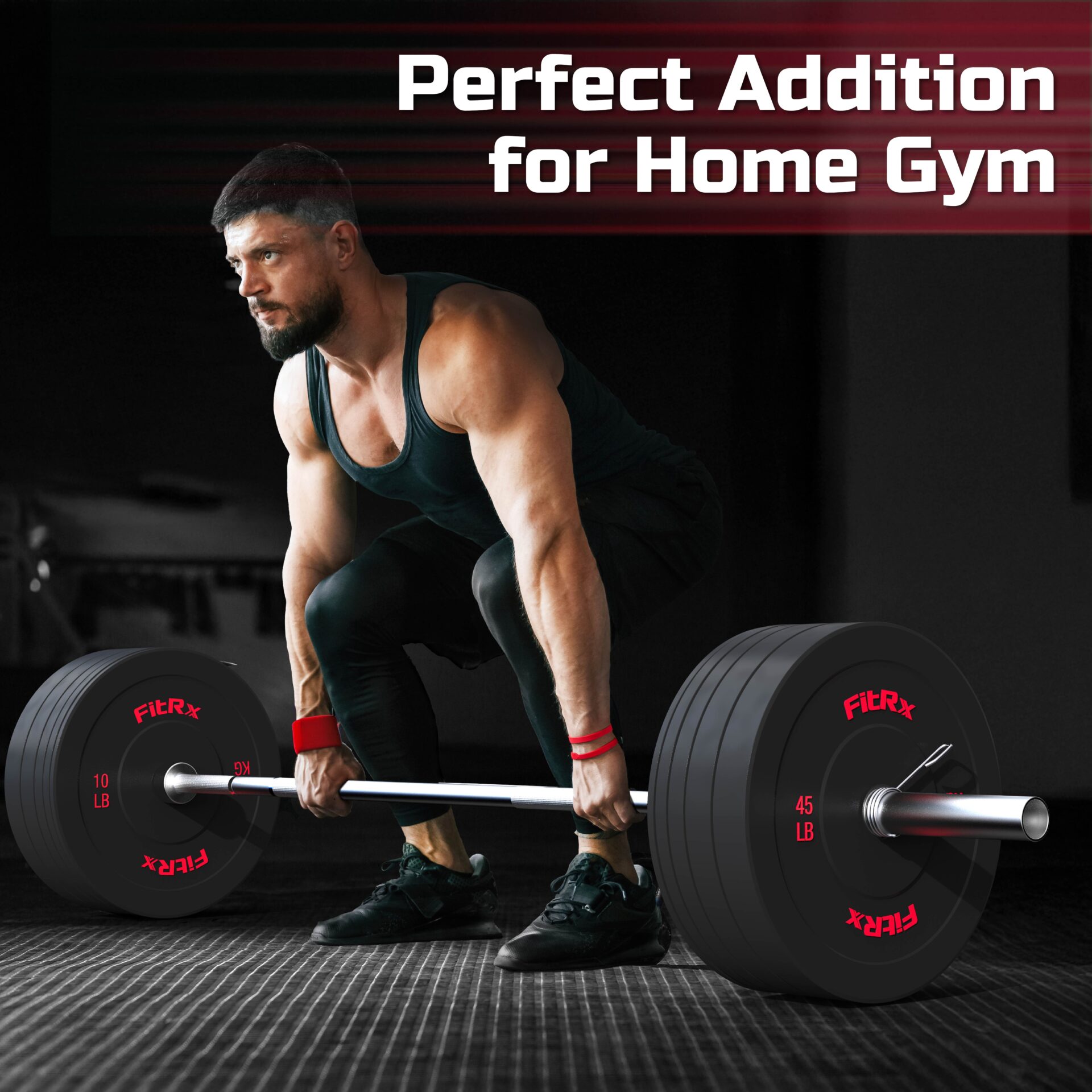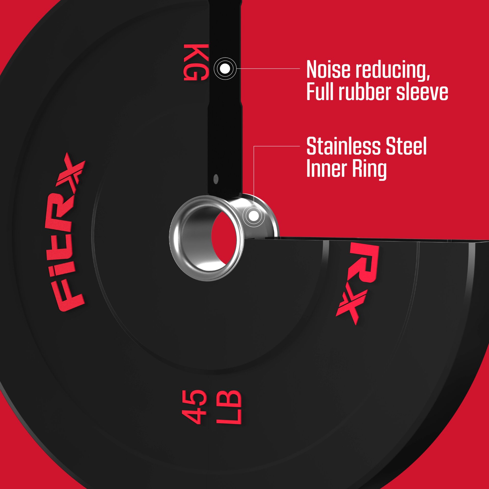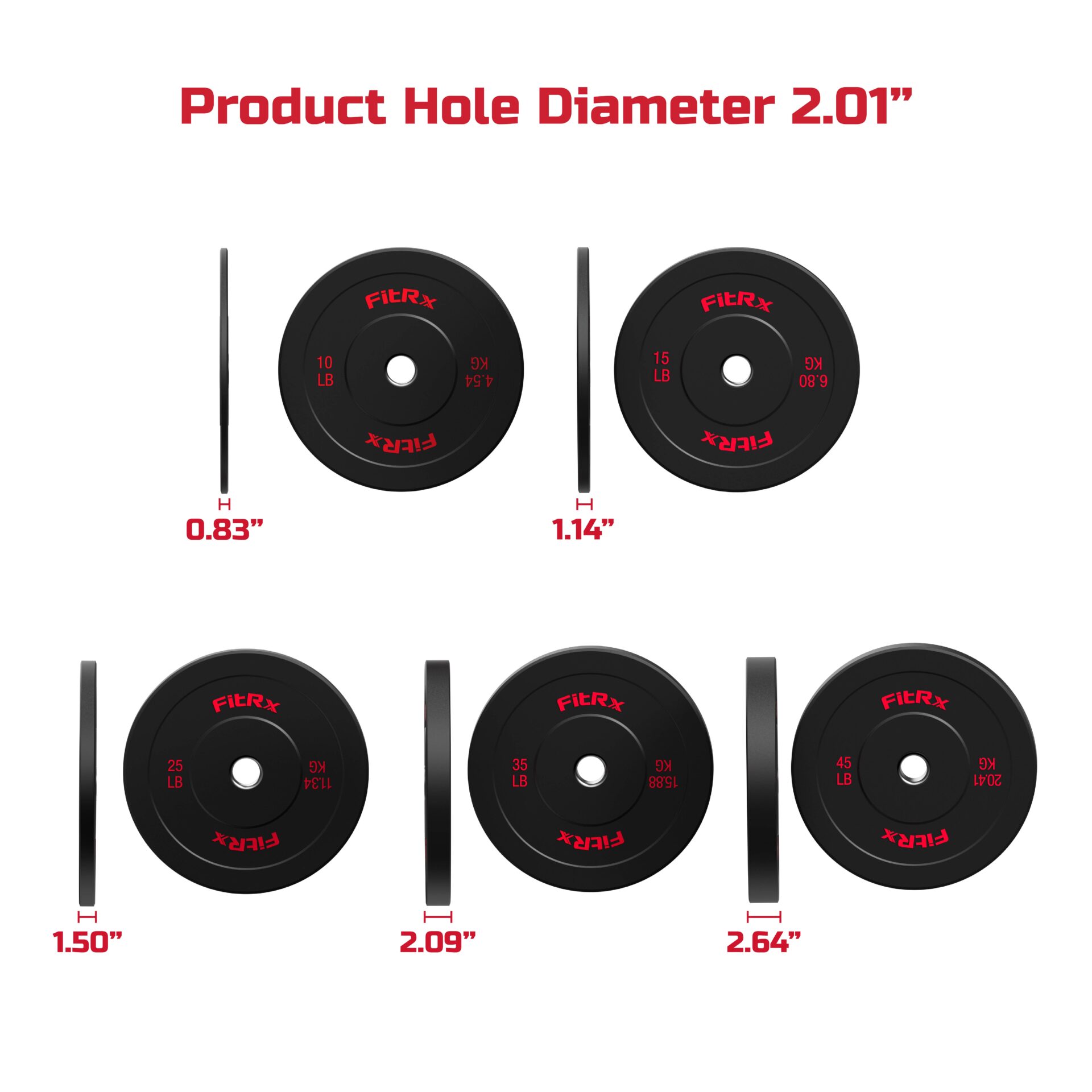 Level up your training with the FitRx 45lb Bumper Plates, Pair. Built for strength, durability, and safety, these Olympic weight plates feature a 2-inch stainless steel center ring for a secure fit on any Olympic barbell. The full rubber coating helps protect your floors, reduce noise, and extend the life of your free weights. Whether you’re powerlifting, Cross Training, or building strength at home, this barbell weight set is the perfect addition to your gym. These 45 lb plates are versatile enough for squats, deadlifts, bench press, cleans, and more making them ideal for anyone looking to expand their weight set for home gym or garage gym.