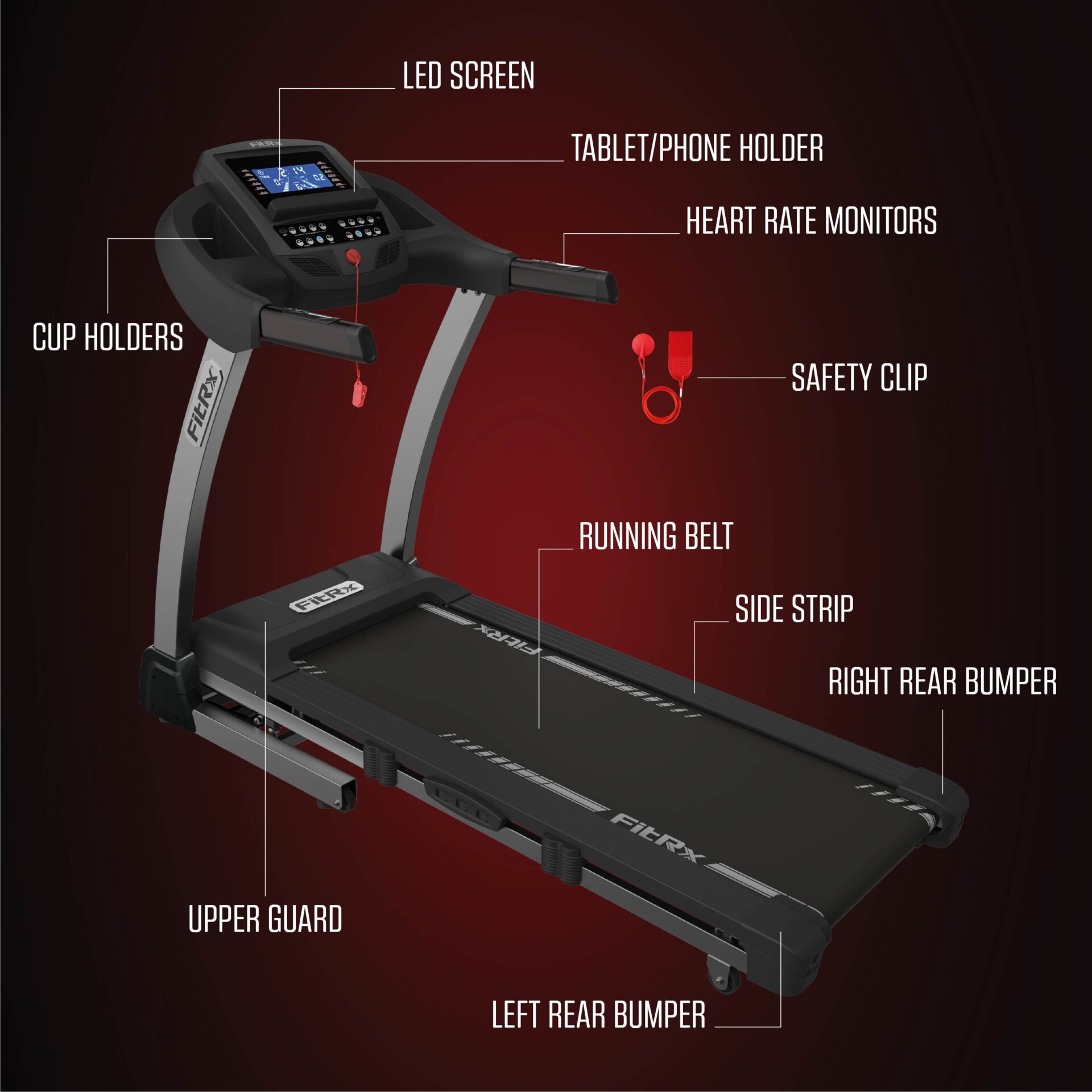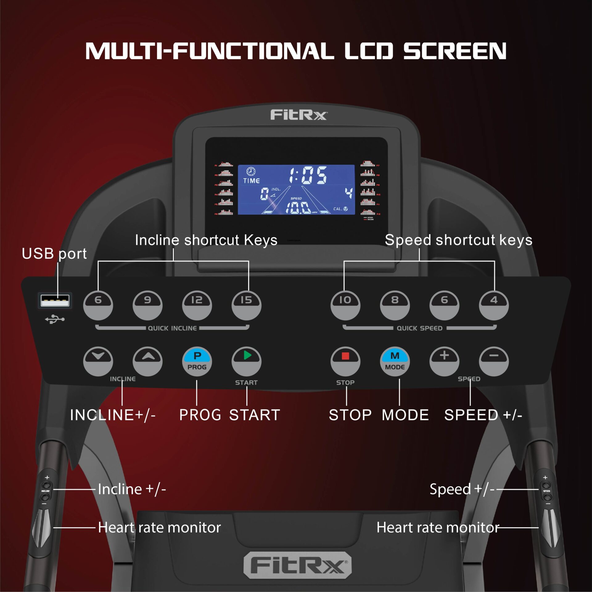 • LED console with heart rate monitor and Bluetooth
