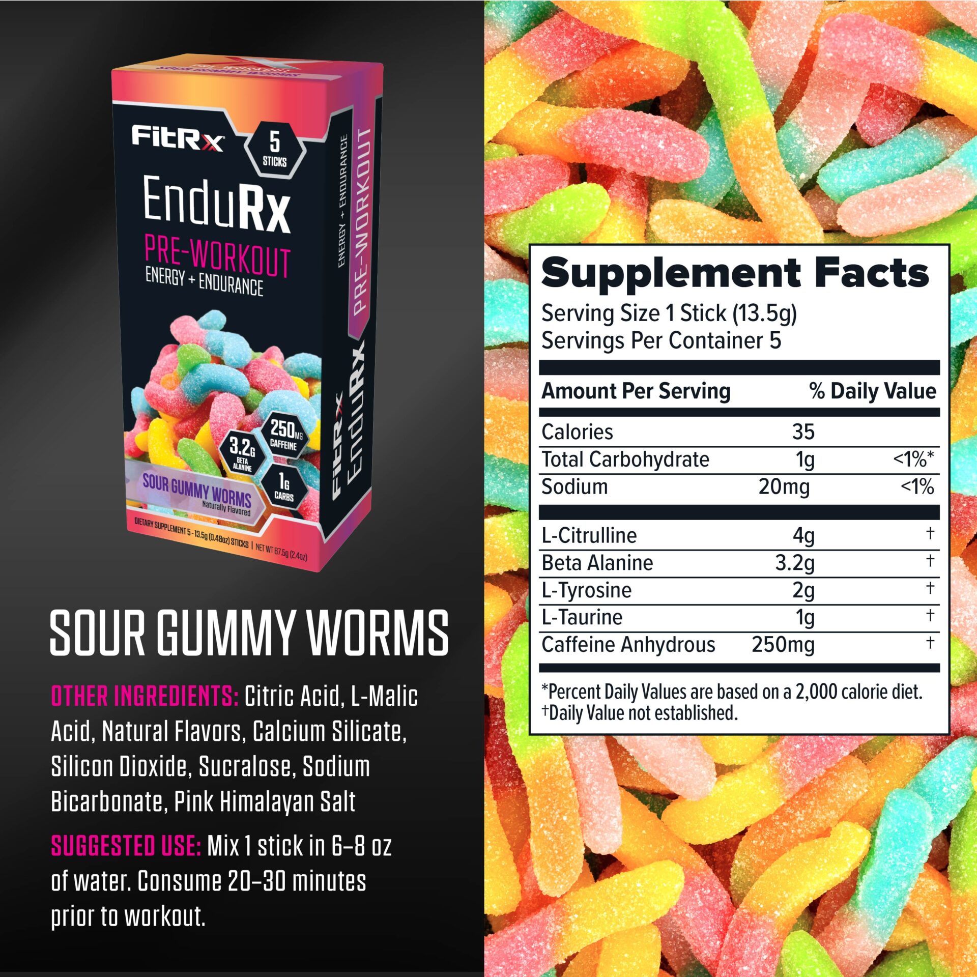 Get ready for your workout with FitRx EnduRx Sour Gummy Worm Pre Workout Powder, a sweet-and-sour preworkout option formulated for athletes and anyone seeking convenient, on-the-go pre training support. Each packet provides 250mg of caffeine for energy support along with 3.2g of beta alanine, a key ingredient known for supporting endurance during high-intensity exercise.