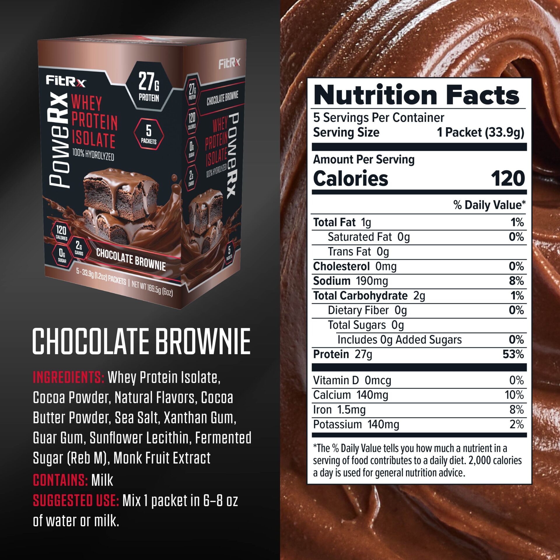 This whey protein powder mixes smoothly with water or milk, creating a rich Chocolate Brownie flavor without chalkiness. With 0g sugar, 2g carbs, and only 120 calories, it fits seamlessly into low-carb, high-protein, or calorie-conscious nutrition goals.
