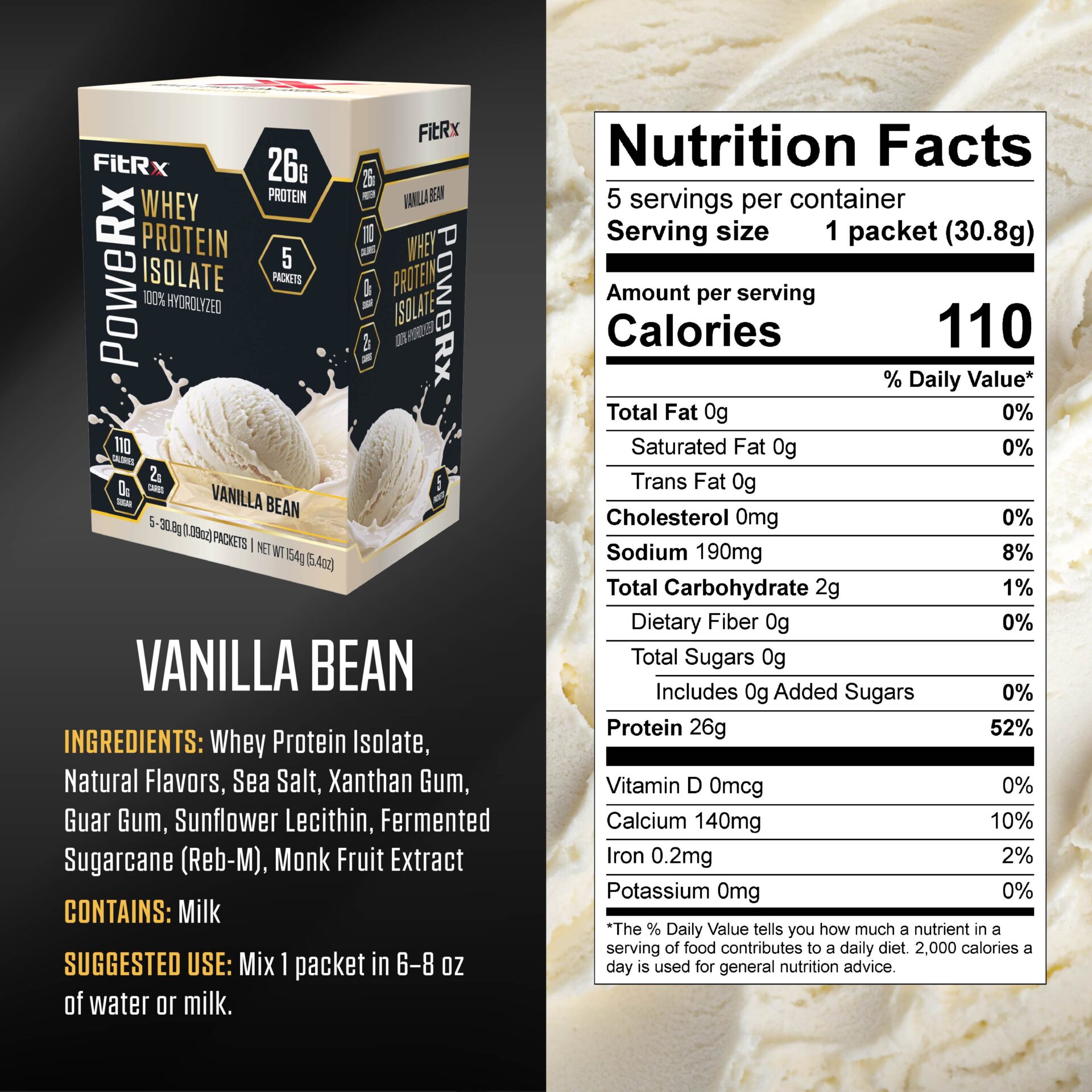 Fuel your workouts and recovery with FitRx PoweRx Whey Protein Isolate, a high-quality whey protein powder formulated for athletes and active lifestyles. Each serving provides 26g of fast-absorbing whey isolate, delivering the clean, high protein support needed for muscle repair and lean strength goals. With 0g sugar, 2g carbs, and only 110 calories, this protein powder fits easily into low-carb, high-protein, and calorie-conscious nutrition plans.
