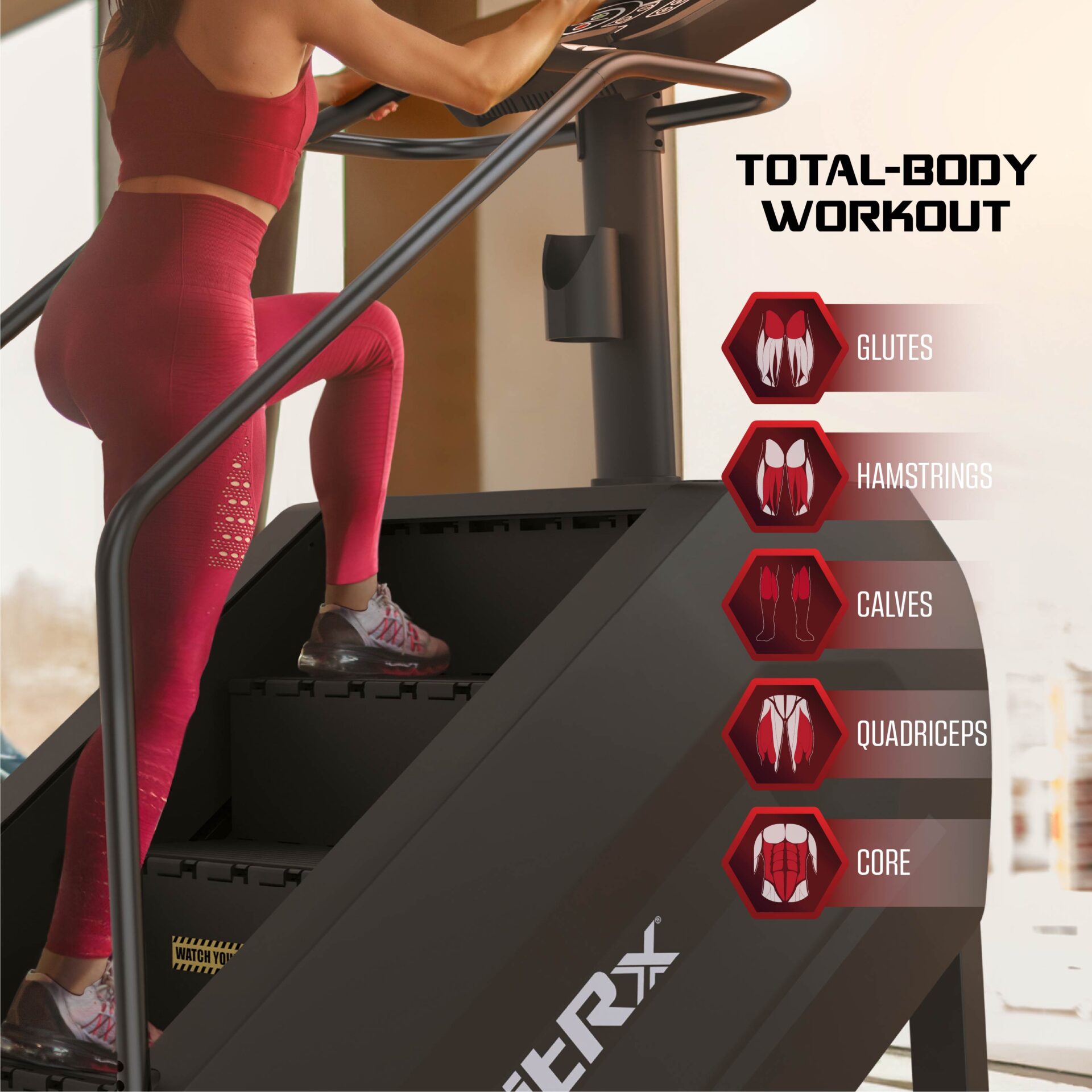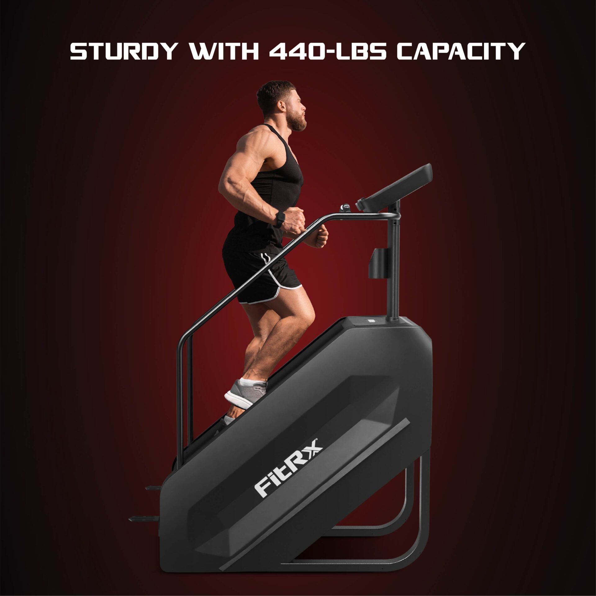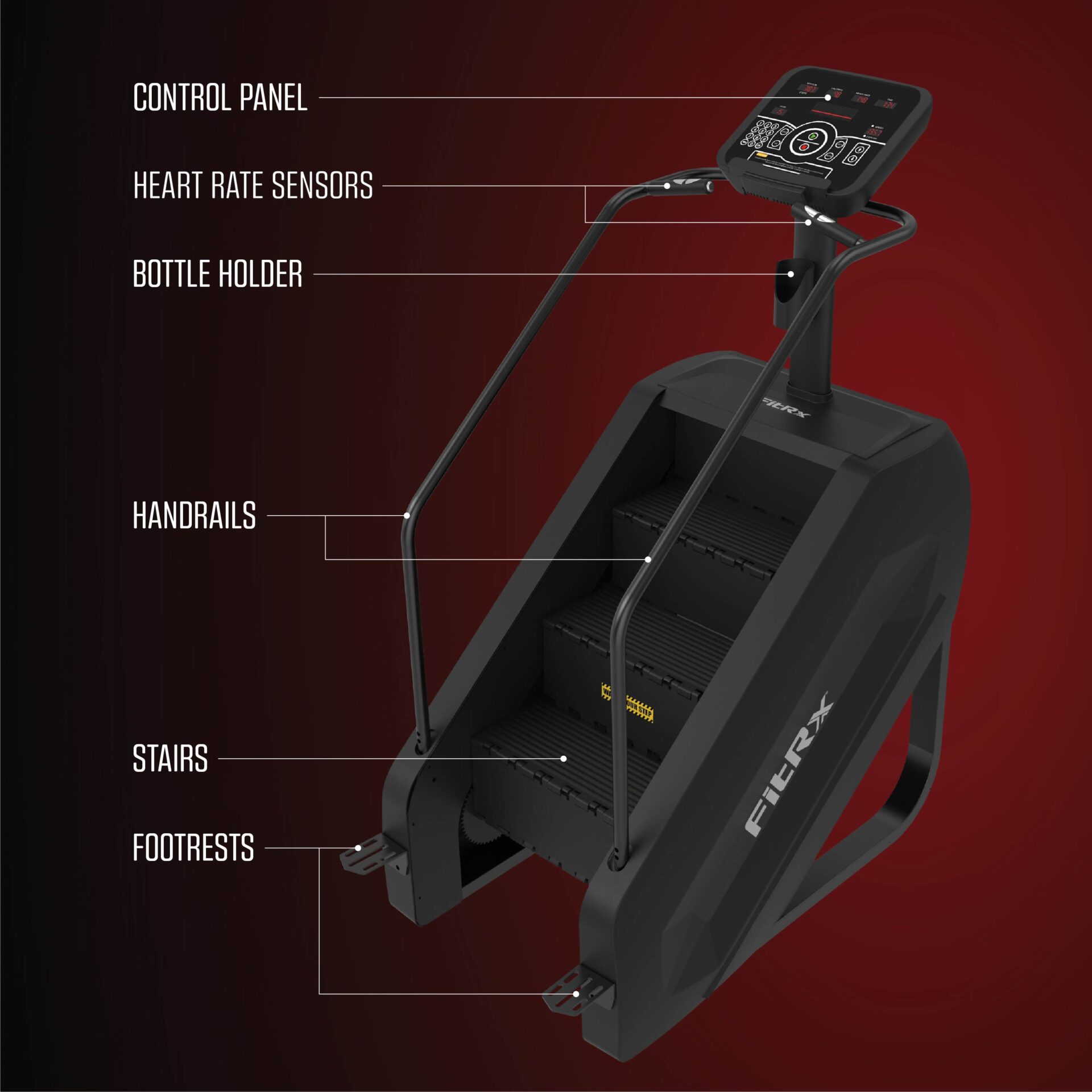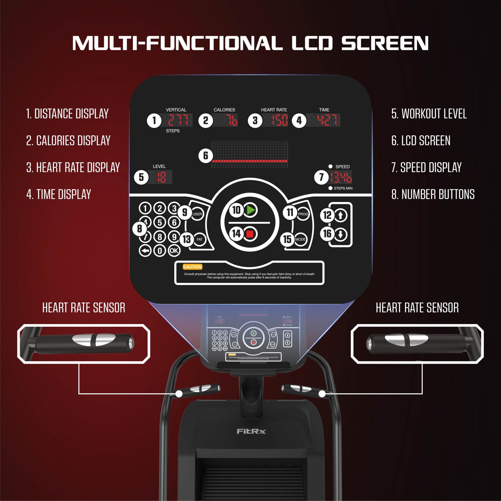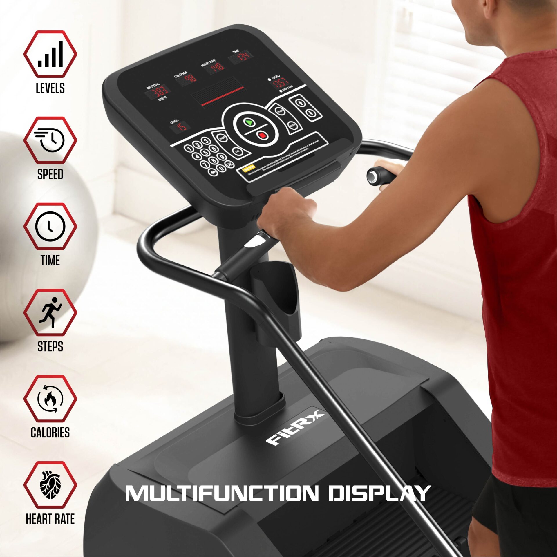 The FitRx Summit Stair Climber Machine provides a steady climbing motion designed to support lower-body training with controlled stepping on anti-slip stairs using the stair climber platform. Its integrated handrails and heart rate sensors offer additional stability and real-time monitoring during use with this compact stepper system. The LCD display shows time, calories, and heart rate to support straightforward tracking throughout each session.