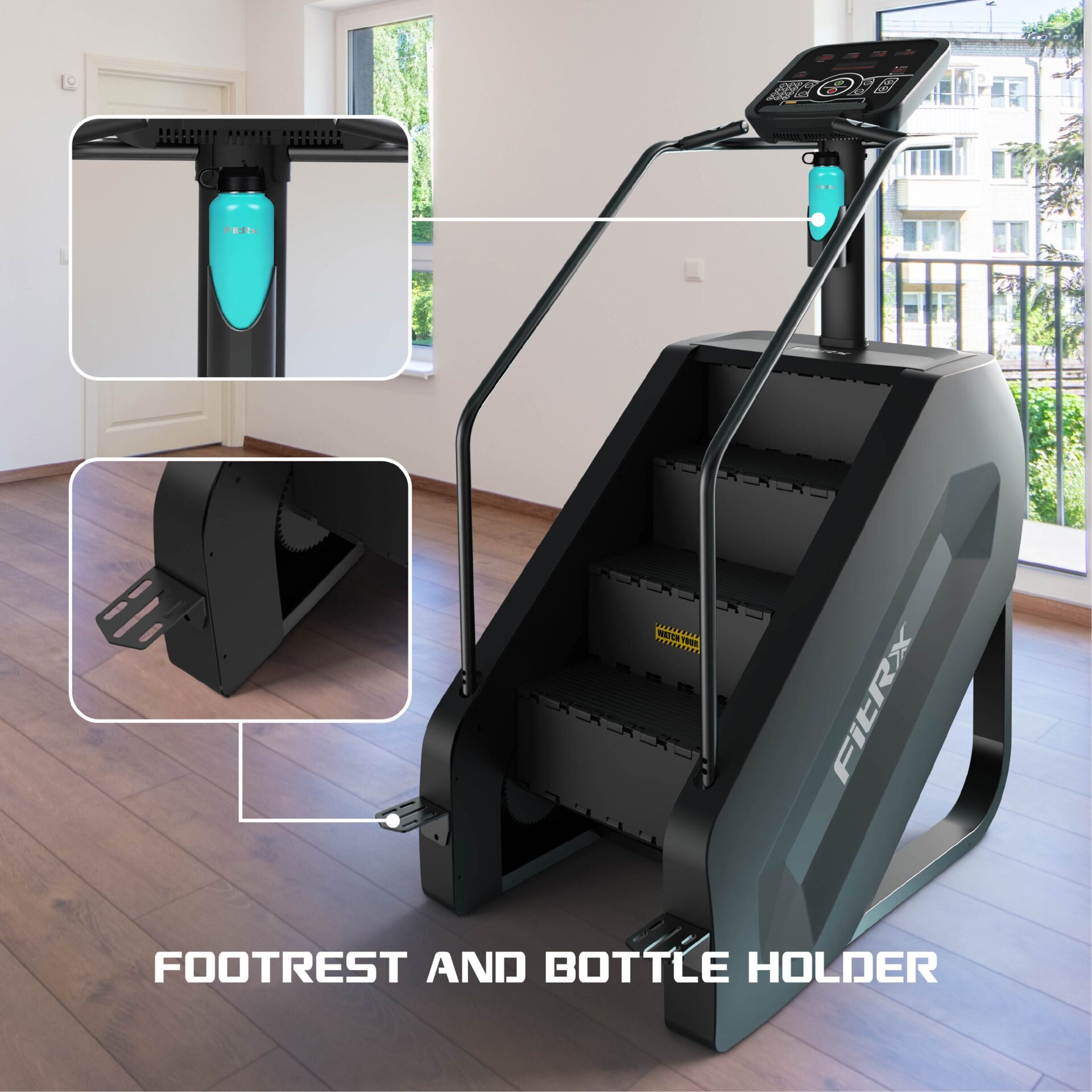 The control panel allows simple adjustments to speed and resistance for consistent performance on this stair stepper unit. Its display layout is structured for quick visibility of time, calories, and heart rate, ensuring clear access to essential metrics when using the step machine interface. A built-in bottle holder and footrest support short breaks and stable positioning when needed.
