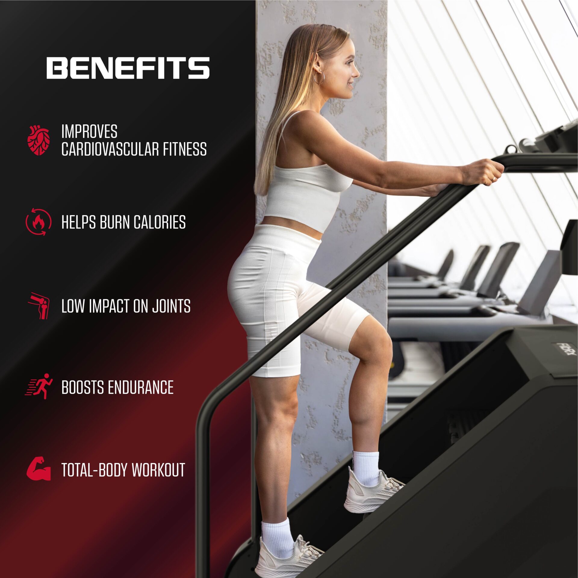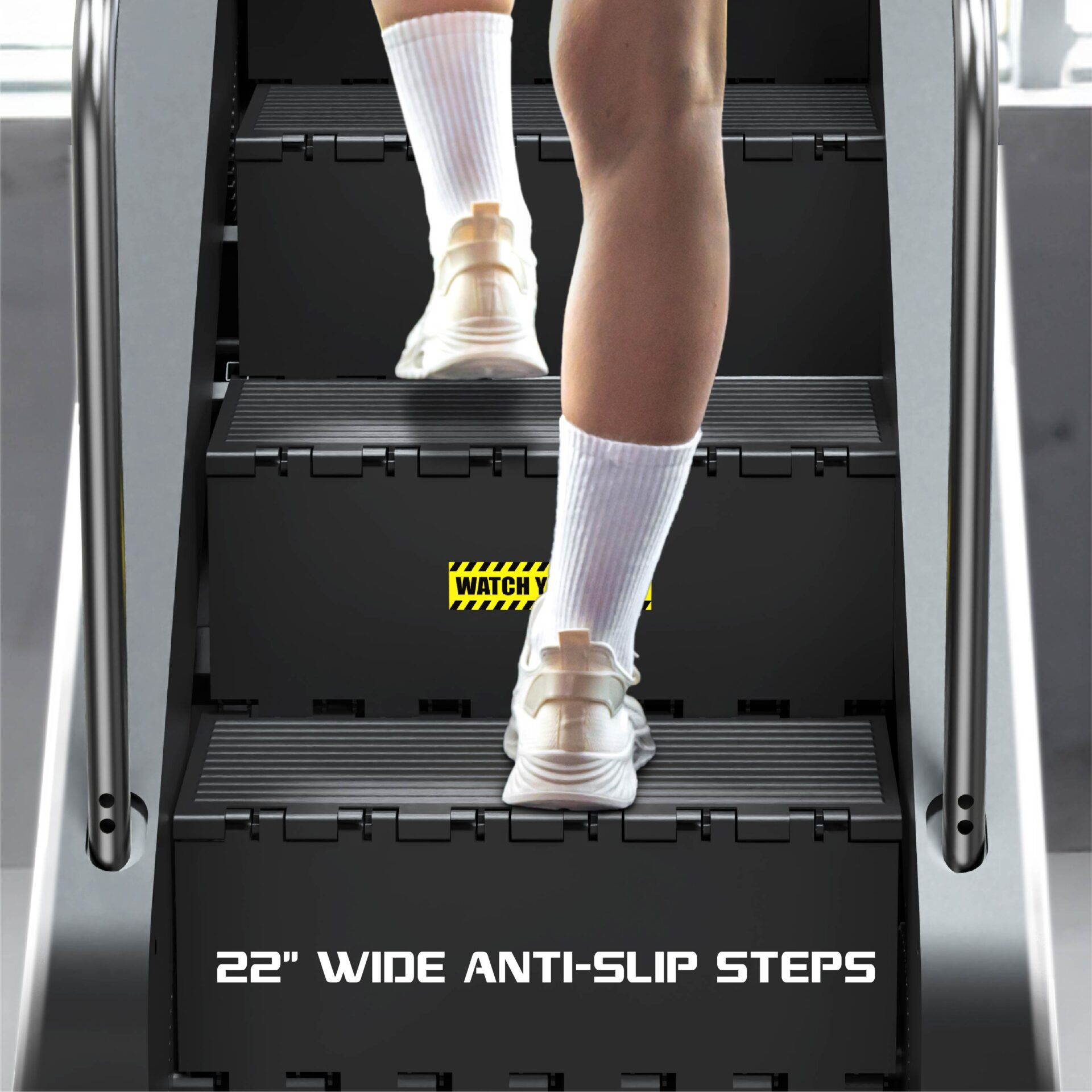 A sturdy frame supports up to 440 lbs and is reinforced with anti-slip stairs and handrails on this stair climber exercise machine. The included assembly hardware, tools, and AC power cord provide complete setup functionality for the stair stepper design. Product dimensions measure 49.21 x 32.28 x 81.89 inches, with a total product weight of 400 lbs.