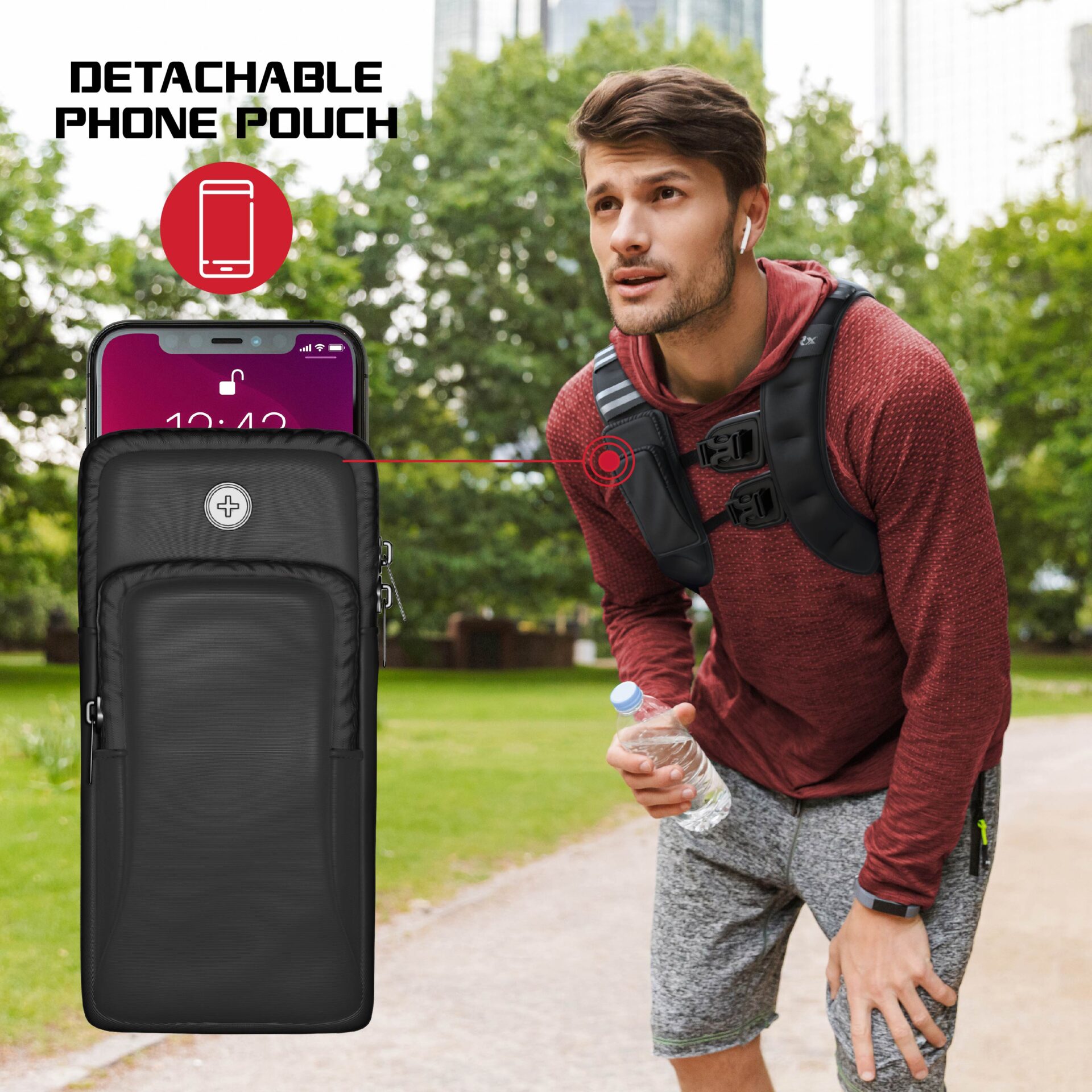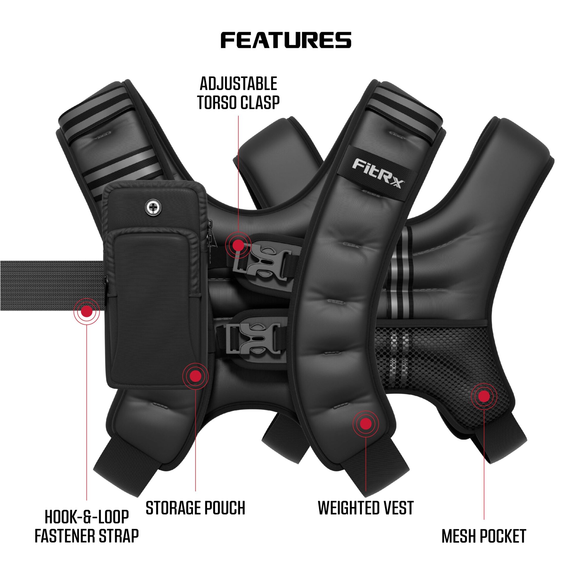 The included storage pouch attaches to the vest using the hook-and-loop strap, providing optional space for a phone, keys, or other small items during weighted vest workouts. The set includes the FitRx 20 lb weighted vest, storage pouch, and user guide so the components are organized for first use. Vest dimensions are 18.9 x 15.35 x 2.76 inches and the pouch measures 3.8 x 7.56 x 1.3 inches, providing defined sizing within your weighted vest men gear.